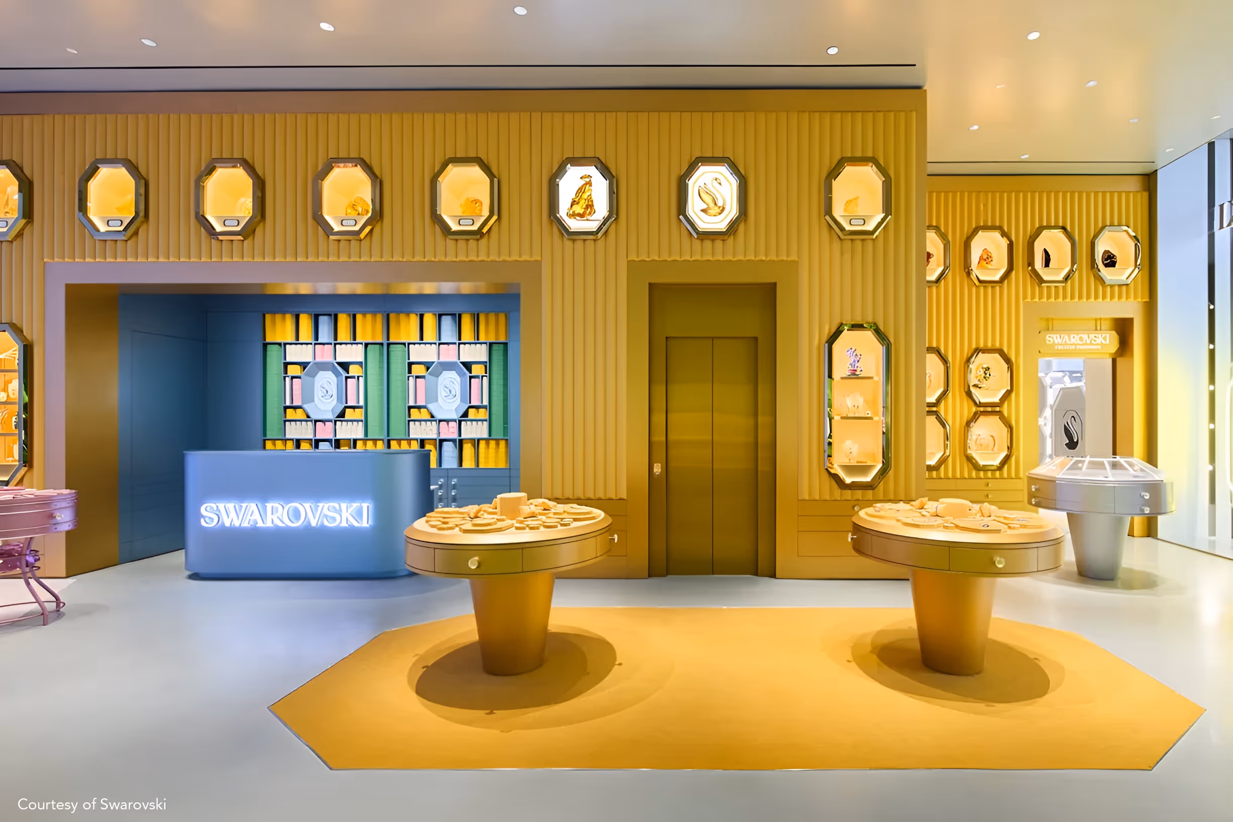 The result is a sophisticated retail space with distinct interior areas, each reflecting Swarovski's elegance and craftsmanship, providing a seamless and immersive shopping experience.